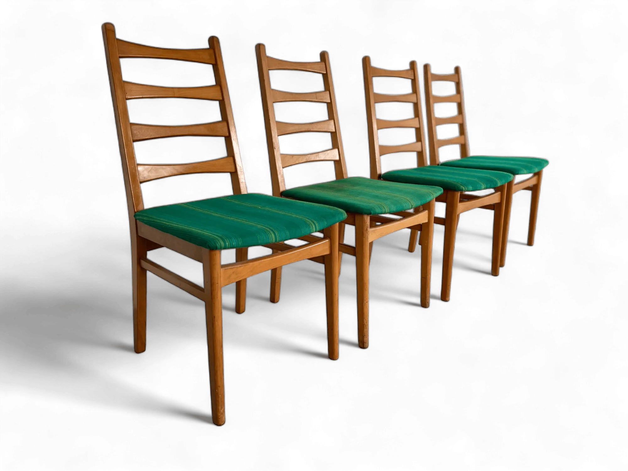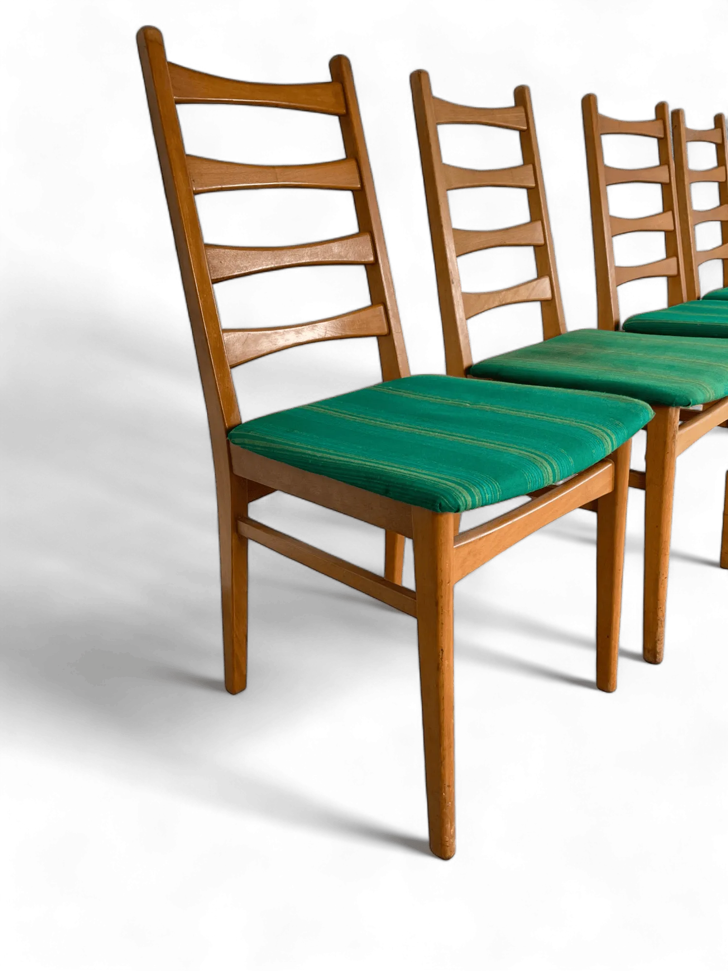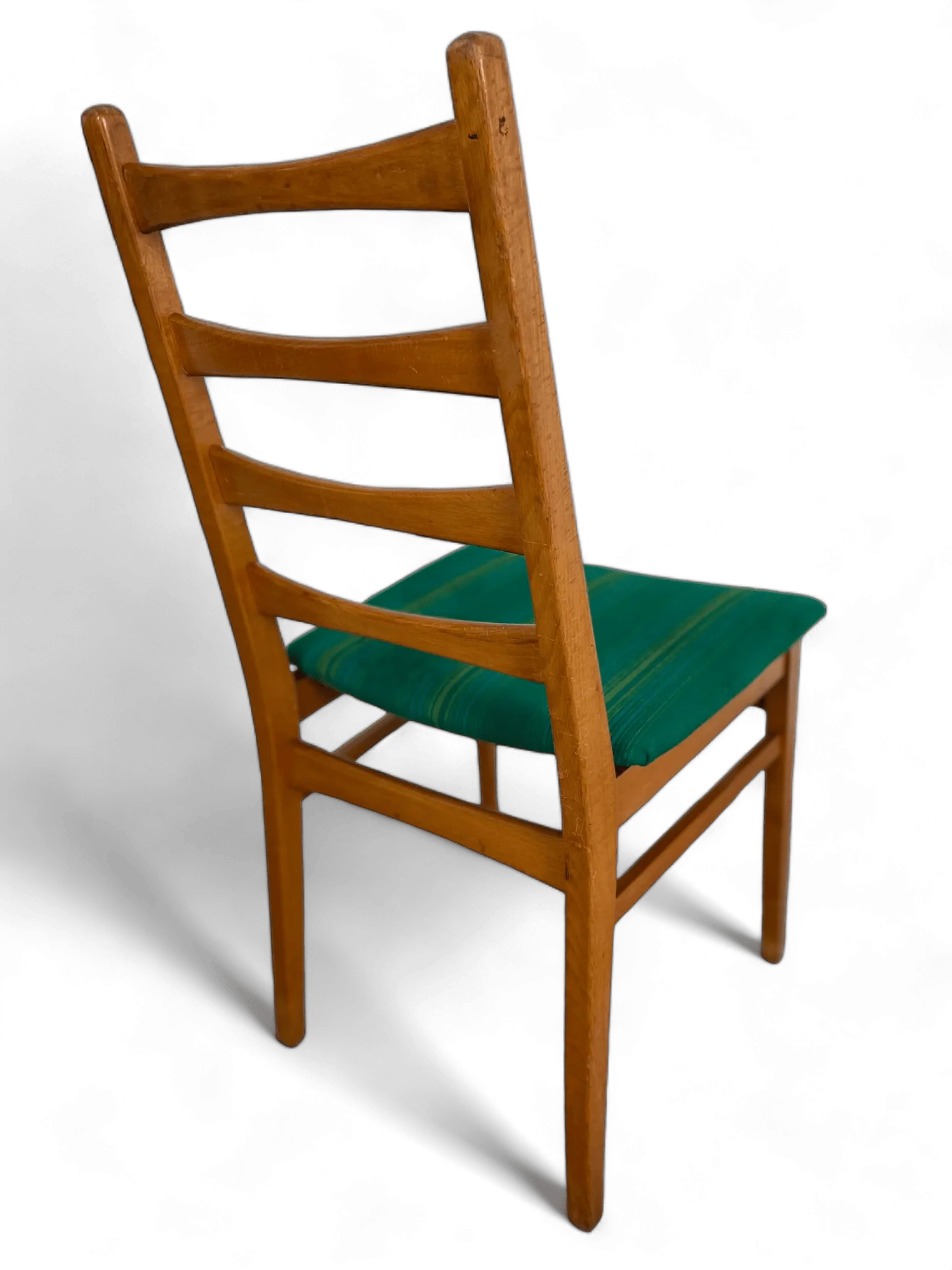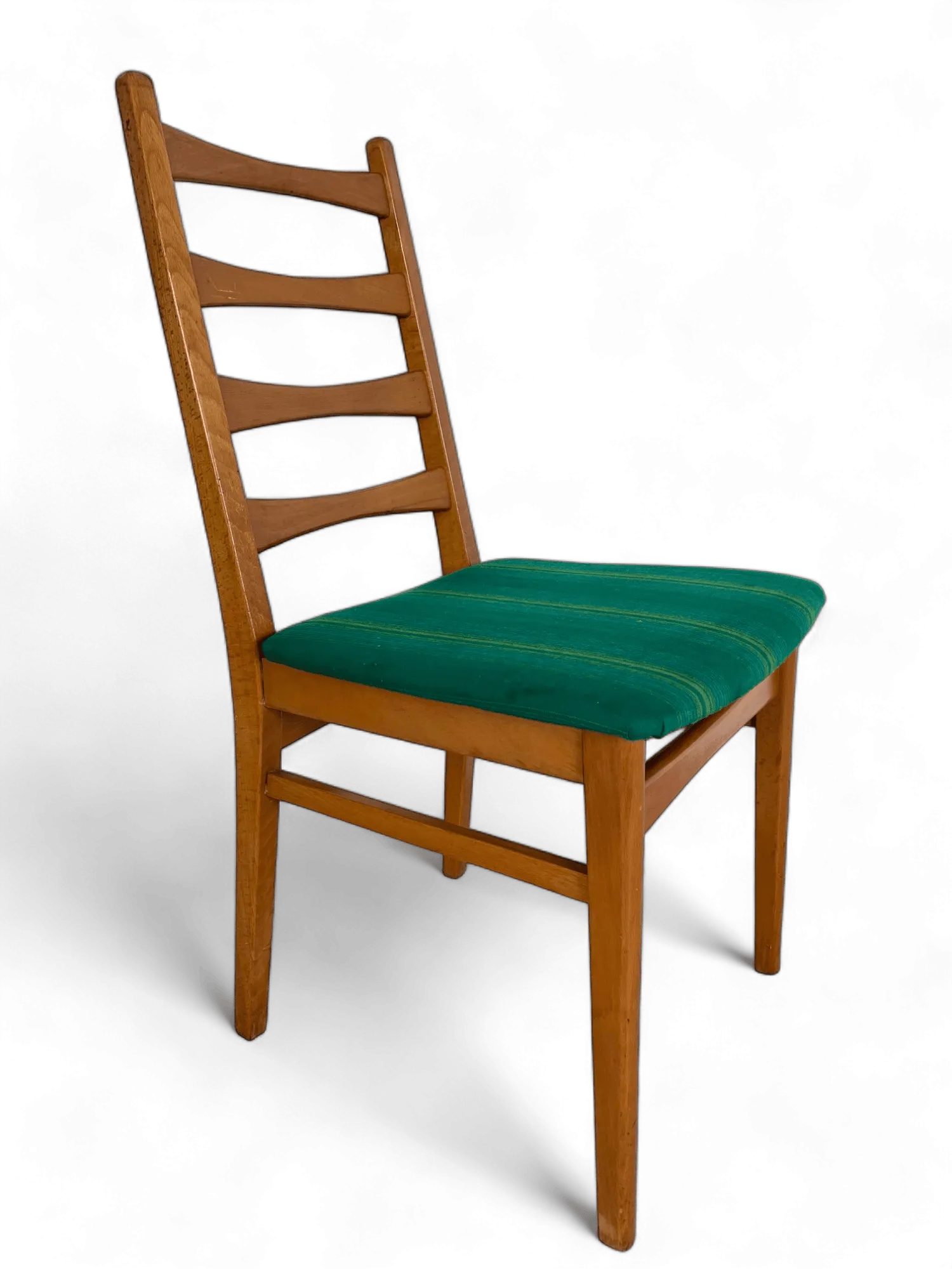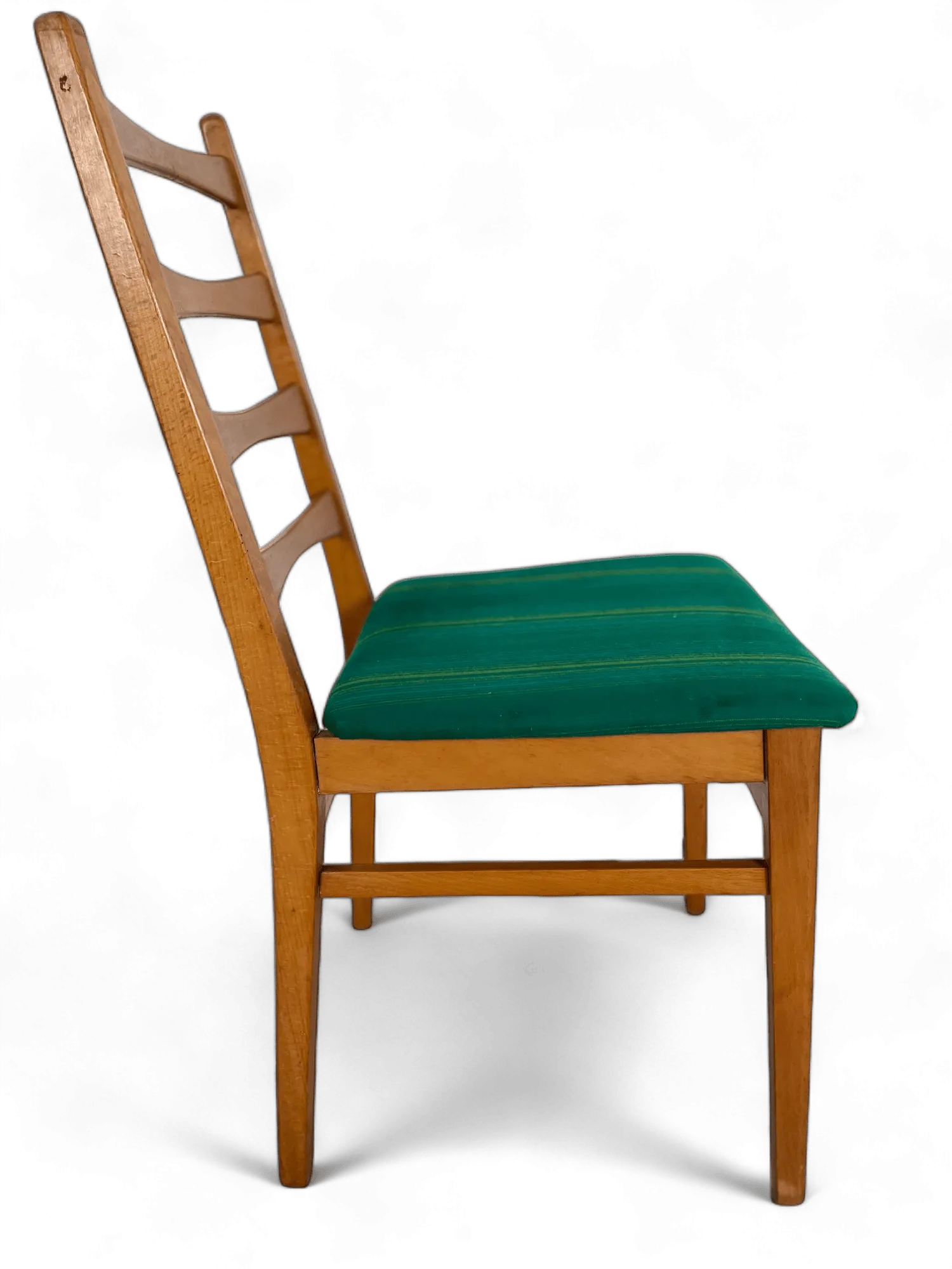 The design of these chairs typically includes slender, tapering legs and a contoured backrest, providing both style and comfort. The seat itself is usually upholstered with period-appropriate fabrics, such as textured tweeds or vinyl, in colors that complement the wood's warm tones. This upholstery not only adds a layer of comfort but also a visual contrast that enhances the chair's elegant silhouette.